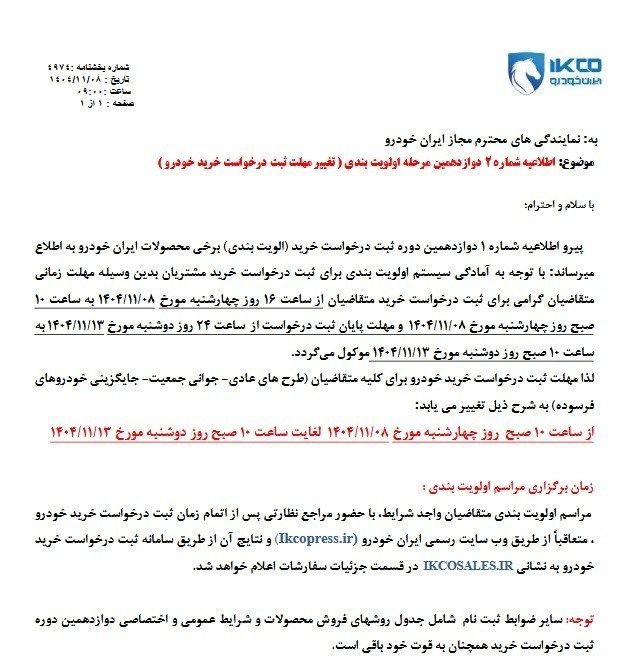 مهلت ثبت درخواست خرید خودرو برای کلیه متقاضیان (عادی- جوانی جمعیت - جایگزینی خودروهای فرسوده): از ساعت 10 روز چهارشنبه مورخ 1404/11/08 تا ساعت 10روز دوشنبه مورخ 1404/11/13 است.