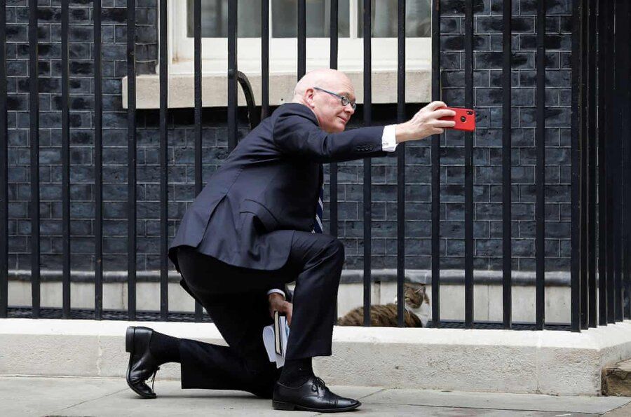 کریس سید، وزیر امور خارجه و بازرگانی نیوزیلند در بیرون مقر نخست‌وزیری انگلیس در خانه شماره ۱۰ خیابان داونینگ با «لری» گربه نخست‌وزیری سلفی می‌گیرد.