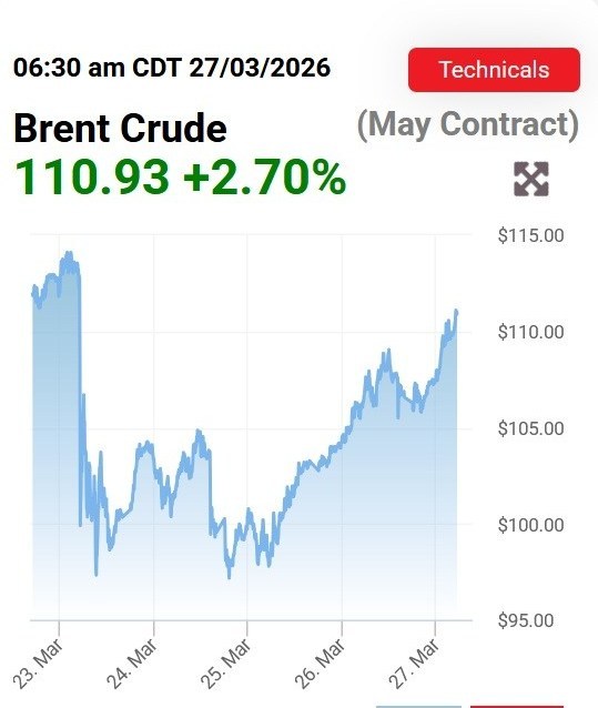 به گزارش اقتصادنیوز به نقل از تسنیم، قیمت هر بشکه نفت برنت (تحویل ماه می) در معاملات روز جمعه 27 مارس 2026 به مرز 111 دلار نزدیک شده است.
